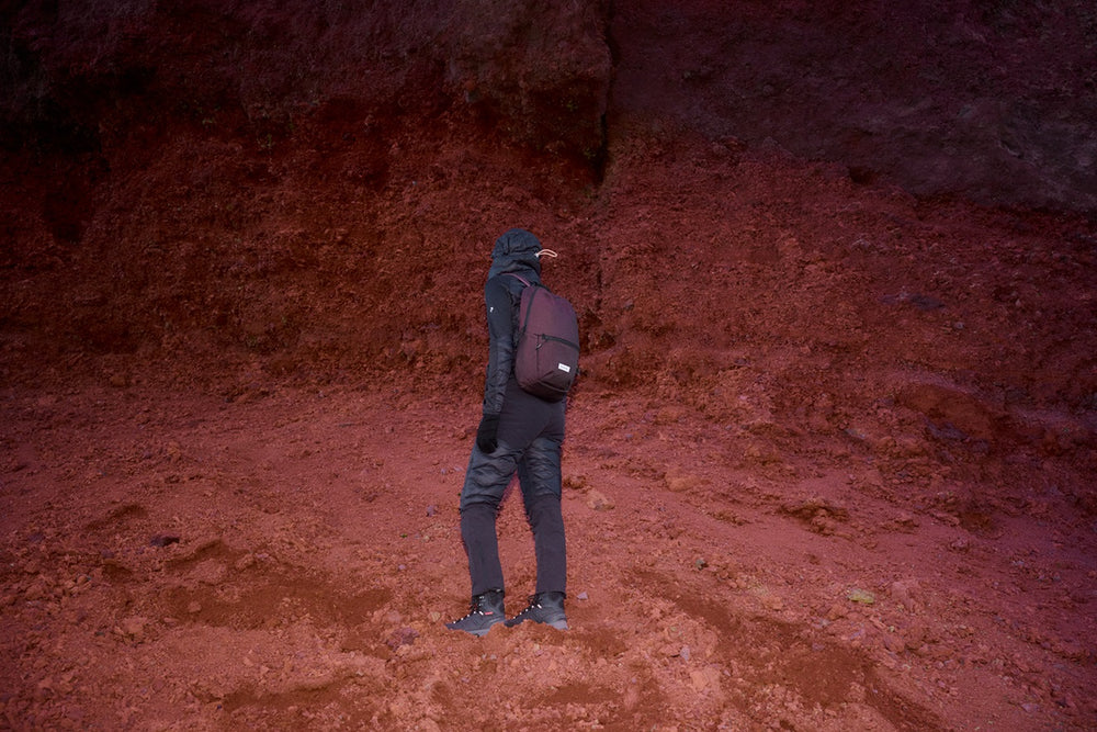 Diese kräftige Farbe erinnert an die tiefroten und dunklen Farbtöne des Lavagesteins, das einst flüssig die Erde formte und mit der Zeit abkühlt und wieder in festen Boden übergeht. Diese Lavafelder stehen als Symbol für die Ursprünglichkeit und den Wandel – genauso wie der Rucksack darauf ausgelegt ist, nach seiner Nutzung wieder in den Materialkreislauf zurückzukehren.