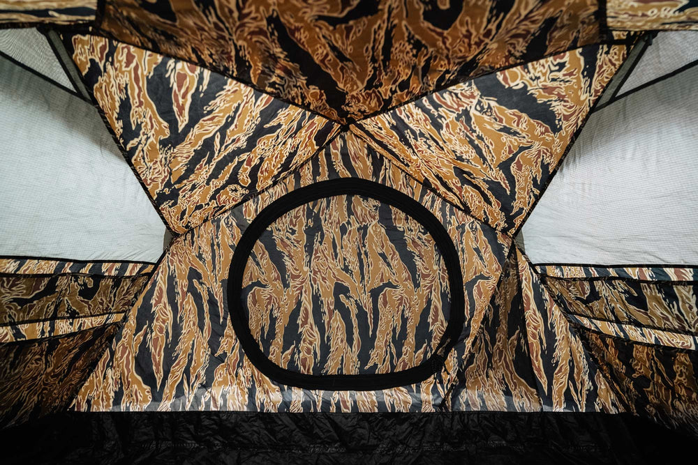 Das aufblasbare Zelt in limitierter Auflage, das die Ästhetik von Maharishi mit dem Zeltdesign von HEIMPLANET verbindet, ist perfekt für 2-3 Personen. Für die Zusammenarbeit hat Maharishi ein besonderes DPM ausgewählt: Golden Tigerstripe Camouflage - eine Reproduktion eines seltenen vietnamesischen Tigerstripe Musters ist.
