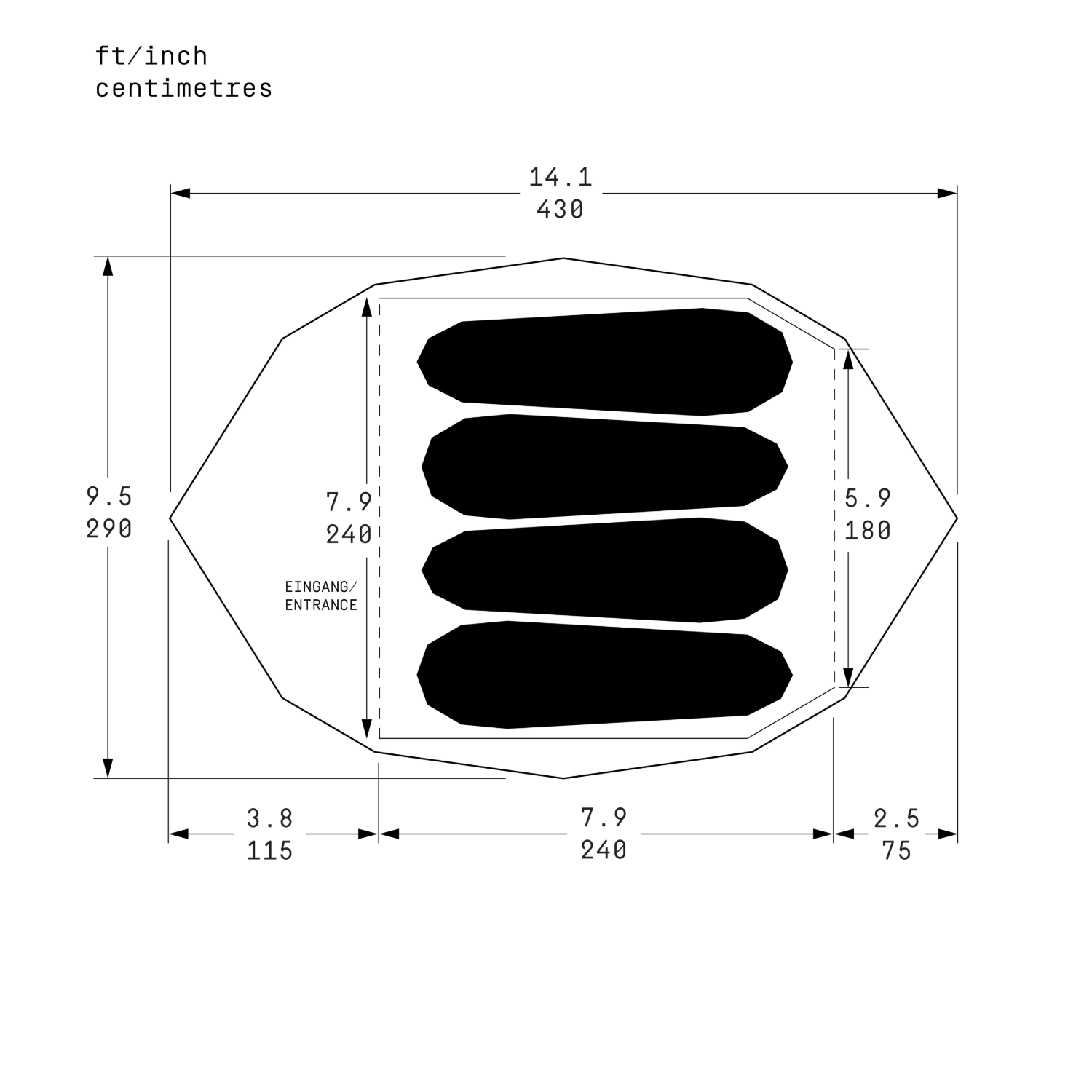 Die Höhe des Außenzeltes kann sowohl von innen als auch von außen an beiden Seiten des Zelts verstellt werden. Zusammen mit den verschließbaren oberen Belüftungssystemen kann so die Luftzirkulation nach Bedarf angepasst werden. Für maximale Belüftung könnten zu dem die zwei Eingänge des Außenzelts geöffnet werden.
