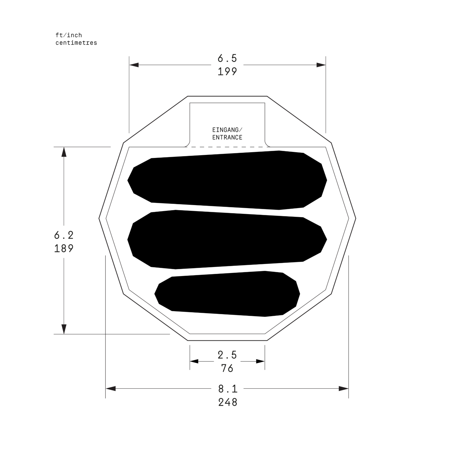 Durch das sternförmige Dach bildet die Mitte des Zelts einen zusätzlichen Stützpunkt. Das Ergebnis ist eine punktsymmetrische Neigung mit fünf Abläufen für Regen.